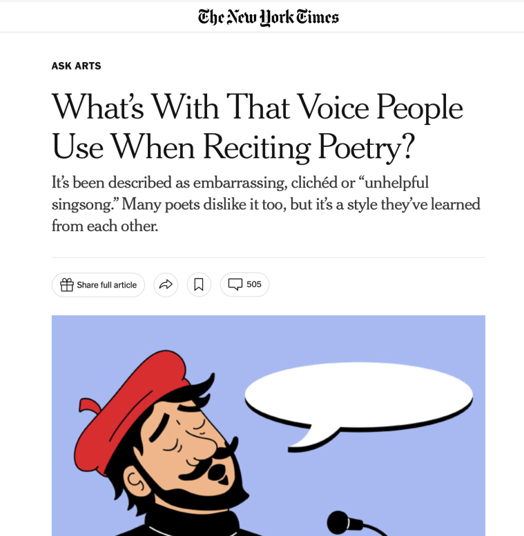 The recent New York Times article digs into this phenomenon, often called the “poet voice,” and asks why many poets fall into the same stylized way of reading their work aloud.